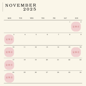 11月の休み 2025.11.05 Tweet Share Hatena Pocket RSS feedly Pin it この記事のタイトルとURLをコピーする Tweet Share Hatena Pocket RSS feedly Pin it この記事のタイトルとURLをコピーする 9月のお休み 前の記事 年末年始のお知らせ 次の記事